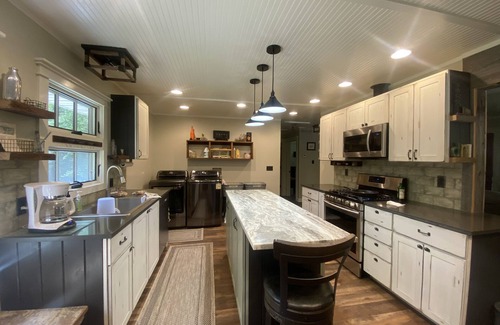Kitchen includes~coffee maker, French press, toaster, microwave, gas stove, oven, refrigerator,dishwasher…also full size washer and dryer.