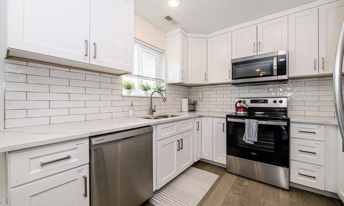 Follow the charming hardwood flooring down the hallway and you'll enter an open-concept main area of the home which boasts a fireplace and 55" TV, and a brilliant new kitchen with stainless appliances and stunning quartz countertops. The kitchen includes everything you'll need for cooking and dining in.