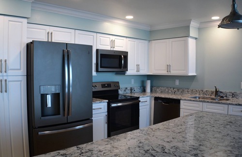The master bedroom has a king bed, ocean-front balcony, flat screen TV, walk-in closet and private master bath. The second bedroom has 2 queen beds, closet and an adjoining bath. The third bedroom has 2 queen beds, closet, and private bath. The bedrooms and the back balcony have spectacular views of the Intracoastal Waterway. The kitchen is fully furnished with microwave, stove, toaster, refrigerator with ice maker, dishwasher, coffee maker, blender, dishware and cookware. The living room, with its comfortable large leather sofa and 3 comfortable chairs, provides a nice conversation or TV viewing area. There is a large flat screen TV and DVD player.