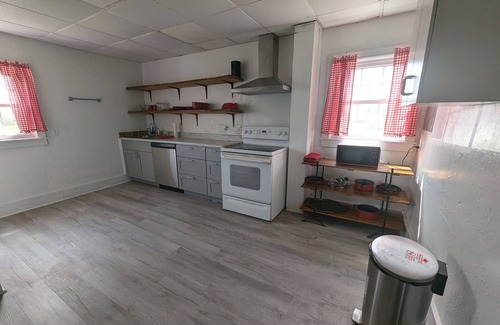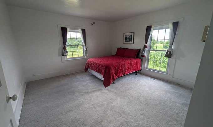 This updated farmhouse has modern amenities, including air conditioning. The home has three bedrooms upstairs, a bath and a half, a kitchen a washer and dryer, a living room, and a dining room. We're happy to assist with any questions while you stay at our farmhouse. Plenty of parking for a few cars.