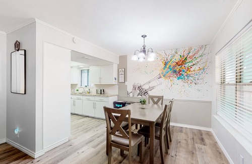 Settle down and enjoy the sunshine from the home's enclosed backyard. Here, afternoon barbecues and late-night fireside chats are inevitable. The interior of the home is just as impressive as the outside. Cuddle up and tune into your favorite TV shows and movies in the sunlit living room. Engage in some playful competition over a game of Ping-Pong or around the vintage arcade system. And show off your culinary skills with ease amongst the full kitchen's stainless steel appliances and granite countertops.