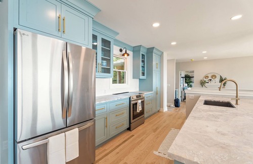 Enjoy your morning coffee from the beverage nook. Wake up each morning with the stunning blue of Lake Michigan dazzling from every window, then grill out on the deck or make delicious meals in the upgraded kitchen stocked with modern amenities, stainless steel appliances, and quartzite stone countertops. You can also work remotely from the dedicated workspace.