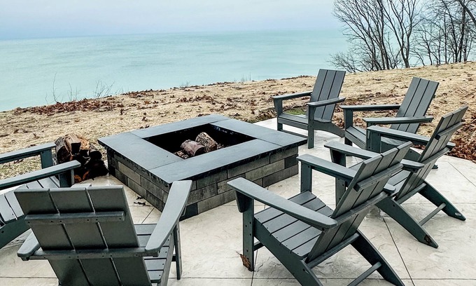 In the evenings, relax on the loungers as the sun sets each night over Lake Michigan, enjoy the hot tub, or gaze up at the stars around the custom stone fire pit.