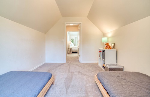 Indoors you’ll enjoy the living room’s Smart TV over a gas fireplace and the sleek, modern furnishings. There’s plenty of space to sit at the unique bench dining table with supplemental seating at the kitchen’s breakfast bar. With its updated stainless appliances, gas range and bright, open vibe, the kitchen is an efficient, pleasant spot for meal prep. A downstairs bonus room gives you space to retreat for quiet conversation and also serves as an effective 4th bedroom with its queen sofa sleeper. The upstairs bedrooms, including a king suite with two toddler beds and a Smart TV, give everyone space for a good night’s sleep. You’ll need it, given your proximity to so many of Bend’s wonderful outdoor activities—Meadowbrook is near Tetherow and Widgi Creek Golf Courses, a mountain bike and hiking trail right out the back door takes you down the Deschutes, the Old Mill Shopping District is four blocks away and downtown is five minutes by car. Invite some friends and book this wonderful retreat for a relaxing and rejuvenating stay in Bend!