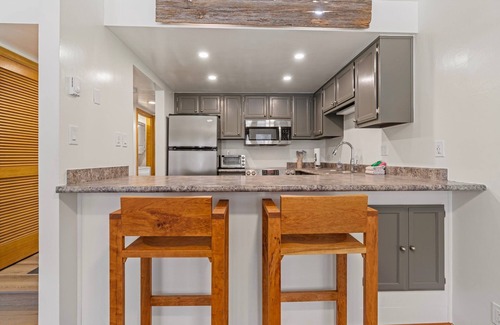 This updated condo has accommodations for 4 and provides a spacious living/dining room with a wood burning fireplace, comfortable couch, and large smart TV. The fully stocked kitchen comes with complementary Keurig coffee, and opens up to the dining room creating an inviting space, and includes two bar top stools perfect for enjoying coffee and breakfast. This condo also provides: