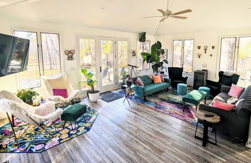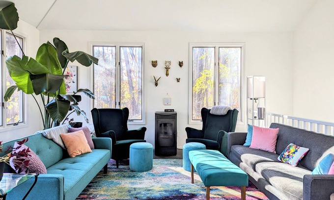 The airy great room with vaulted ceilings has 3 walls of massive windows, two plush seating areas, a 70"TV, a pellet stove for a fire on a chilly evening, a bar cabinet and more. This room overlooks a spacious, private yard full of wildlife. Deer, turkeys, birds of prey, muskrats and more have been seen from the huge back deck. There is a propane fire pit on the deck and the dark night sky and comfortable Adirondack chairs make for great stargazing! A propane grill is right outside the kitchen door and the screened-in porch with an outdoor dining table lends itself to pleasant bug-free meals outdoors or just relaxing while listening to the call of the frogs in the evening.