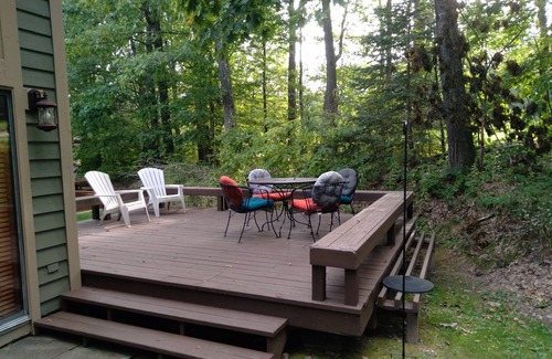 Our guests can enjoy any of the below amenities, relaxing on the deck that overlooks the 16th green, reading on the upstairs balcony while looking through the large windows, enjoying the wood-burning fireplace, enjoying the close proximity to nearby activities, or grilling on the back patio.