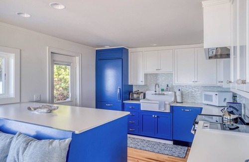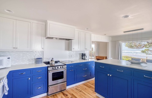You’ll have your own oceanfront island of vacation luxury above magnificent Alsea Bay with a stay in this beautifully updated single-level home. Sky Island’s sweeping oceanfront views of the Pacific and the entrance to Waldport with its sand-spit squadron of harbor seals make a magical setting for time at the coast. You’ll watch the ebb and flow of the tides from a fantastically remodeled home with stunning wood flooring and contemporary furnishings. Even better, the space outdoors includes an ocean-view fire pit, a hot tub, and seating on the deck for gazing at the sea. The living room includes plush sofas and chairs, large windows, and an electric fireplace in the handsome stone hearth. You’ll dine in style with an ocean view in two directions from a table with banquette seating. A sparkly blue and white kitchen has all you’ll need to whip up a feast, including access to a barbecue on the deck outside.