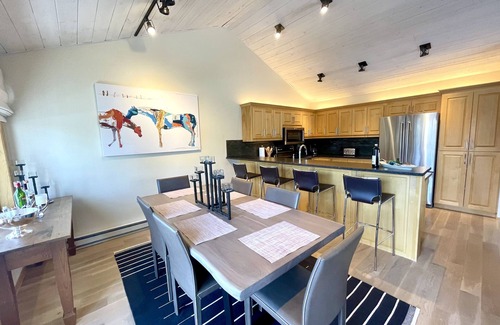 The sleek kitchen is a culinary haven equipped with all your needs for creating a delicious meal, a coffee machine, and an outdoor grill. Culinary enthusiasts will delight in preparing gourmet meals, which can be enjoyed at the breakfast bar, adorned with four comfy stools, or the rustic dining table graced with six upholstered chairs. Additional seating options are available on the covered patio. Another patio just below provides first-level sunset viewing and an occasional wild neighbor like a moose, deer, or eagle!