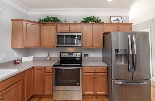 The kitchen is fully equipped with a dishwasher, sink and island for preparing food. The kitchen is filled with plenty of cookware, plates and items to make your stay comfortable: Coffee maker, Toaster and Large Refrigerator. Laundry room features washer and dryer and is equipped with detergent and cleaning supplies.