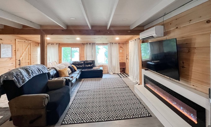 Inside, the cabin's updated interior boasts all of the necessary comforts. Sit back and warm up in front of the gas fireplace in the living room while you tune into your favorite TV show or movie. The adjacent well-equipped kitchen makes cooking a breeze with its stainless steel appliances, utensils, and coffee station. Additional window air conditioners in each bedroom and heating throughout the home ensures year-round comfort.