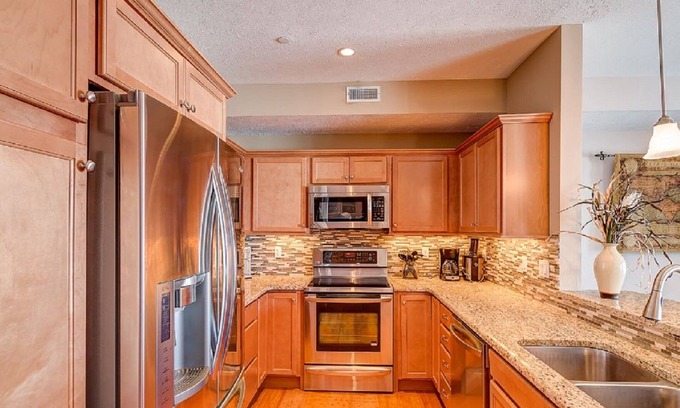 You’ll sleep well in the master bedroom with a king-sized bed on a memory foam mattress, large closet, spa-like bathroom with a glass walk-in shower and rainfall shower head .Master bedroom has cable tv. #305 sleeps six guests with the addition of a queen size sleeper sofa.