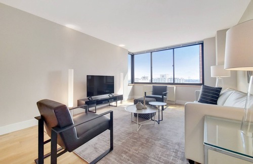 Enjoy your stay in this spacious two-bedroom apartment in a luxury building. The apartment features a fully-equipped kitchen, ample closet space, and stainless steel appliances. All beds provided are fitted with plush linens and pillows. All Furnished Quarters apartments include 24/7 guest service.