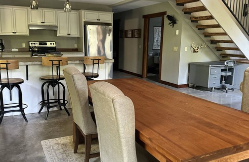 The Lazy Bear offers an open layout living and dining area with a lofted ceiling and a fully equipped modern kitchen. The full bathroom offers a clawfoot tub and shower. The master bedroom offers a full bed and the large loft space has two twin beds and a queen Aerobed.