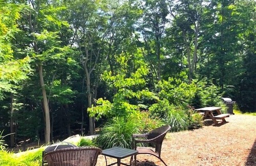 This artisan cabin was recently built by the hosts using cordwood construction techniques. Enjoy the 17 acre property that borders the Manistee National Forest and affords unique wildlife sightings, fishing, hunting, and hiking. This area is well known for whitetail deer hunting and is very near the flight path of migratory waterfowl over Hamlin Lake. Enjoy views of the lake from just outside the cabin and find ease launching kayaks, canoes and the rowboat at the dock along the lake frontage. The frontage is not suitable for docking motor boats, but the Hamlin Lake Boat Launch is only a few minutes from the cabin. The cabin is positioned at the top of a gradually sloped hill and the lake frontage is located approximately 75 yards from the cabin. Access to the frontage will require walking down trails along the hillside.