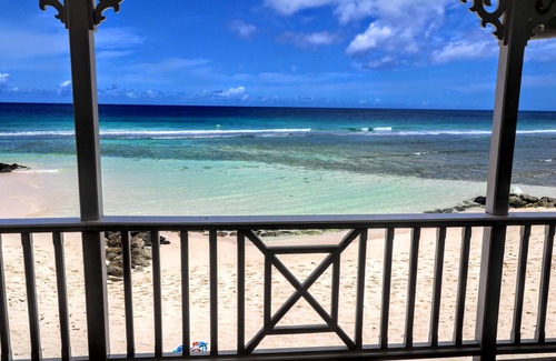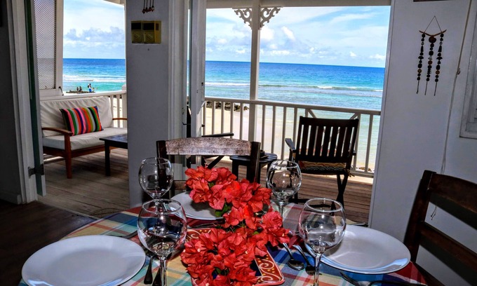 The upper apartment is a two bedroom en-suite, with an open style living area complete with dining out onto the wonderful and picturesque verandah that overlooks the Caribbean ocean. The lower unit offers one huge bedroom en-suite, with open style living area and dining out to a verandah that is exactly 4 feet above the beach. The balconies from both the upper and lower apartments both overhang the beach itself! They can be rented separately or as a complete unit if you so desire.