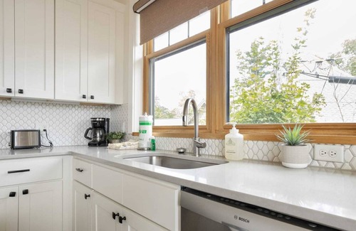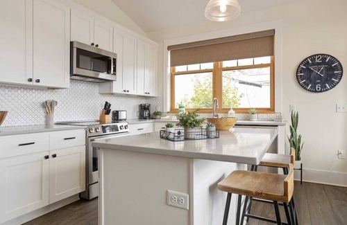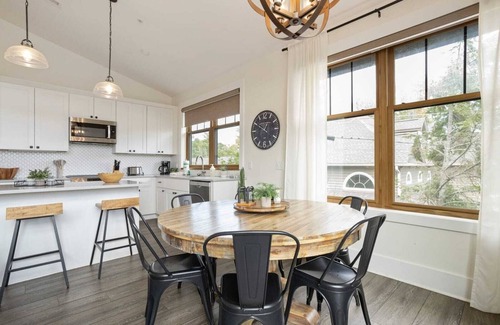 Franklin On Main includes central heat and air, a washer and dryer, and Wi-Fi. Guests can log into their own streaming accounts on each of the Smart TVs. One dog is welcome with your reservation; additional pet fees apply.