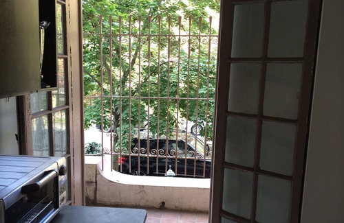 The home is renovated and has 1000 square feet of indoor living space, featuring high ceilings, tall windows and original French doors. Enhancing those quarters are two balconies: just off the kitchen for dining alfresco, and next to the bedroom for morning coffee and quiet conversation outdoors.