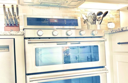 Or simply come for some R&R. You’ll find an inviting front porch with rocking chairs and a swing, a covered back patio with a dining table, sitting area and big screen TV. Enjoy cooking on the Blackstone grill, play a few rounds of corn hole or roast marshmallows over the fire pit. You are likely to see a few 🦌 deer grazing on acorns or grass. Head inside to rest and relax on the comfy leather couch, cook up a delish meal in the modern kitchen or nap in one of the comfy beds. The kids will have fun in the bunk room, with a tv, games and a little ”nook” to call their own.