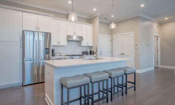 A few steps away is the fresh & bright full chef’s kitchen, large quartz island with seating for 4, and dining area table and chairs with additional seating for 4 more. The kitchen is equipped with full size stainless fridge, commercial style gas range & oven, coffee maker, microwave, dishwasher, and all of your essential kitchen equipment including dishes, wine glasses, silverware, pots & pans, etc.