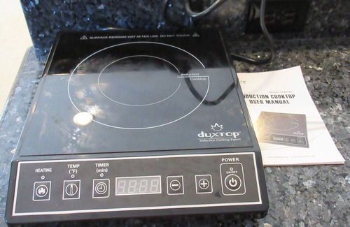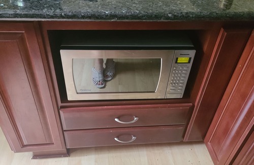 The kitchenette has a sink, garbage disposal, refrigerator, microwave , GE dishwasher, Cuisinart coffee maker, Kitchen Aid convection countertop oven, portable induction cooktop countertop burner, electric kettle, toaster, wine glasses, glasses, cups, plates and tableware.