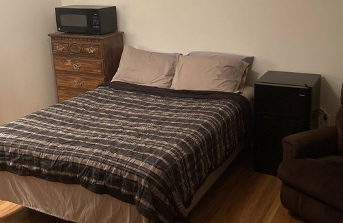 This Private Master bedroom comes furnished with all the amenities! Your own private bathroom only accessible from the bedroom. A Mini fridge, microwave, coffee maker, Mounted Flat screen, access to all shared living spaces including kitchen, and washer/dryer