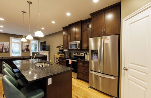 Whether you’re traveling for work or with family, you’ll enjoy a thoughtfully designed, open concept layout, fully stocked kitchen, and a stunning backyard patio with a BBQ — perfect for relaxing.