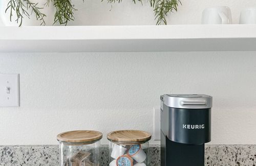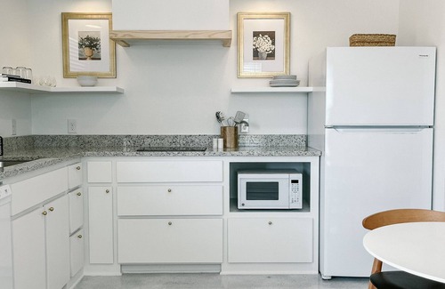 Professionally designed, the space features polished concrete floors, a queen-sized bed, a modern kitchen with stovetop and complimentary coffee, a dining table, fast wifi, a 40" TV, loveseat, private back patio, and a sleek bathroom.