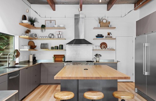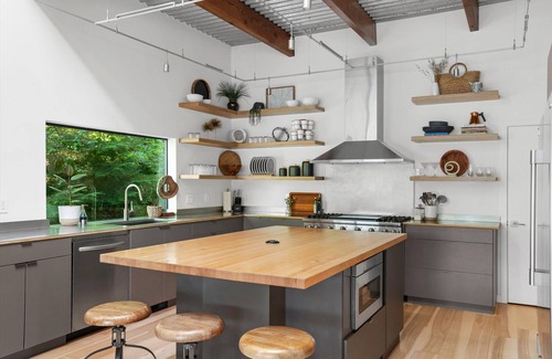 Adjacent to the living room, discover a stately formal dining table, perfect for the entire group to gather around and enjoy a meal on. The modern kitchen comes equipped with ample meal prep space, an island/breakfast bar, an impressive gas range, and an enormous fridge. The chef of your group will love utilizing this space to practice their craft.