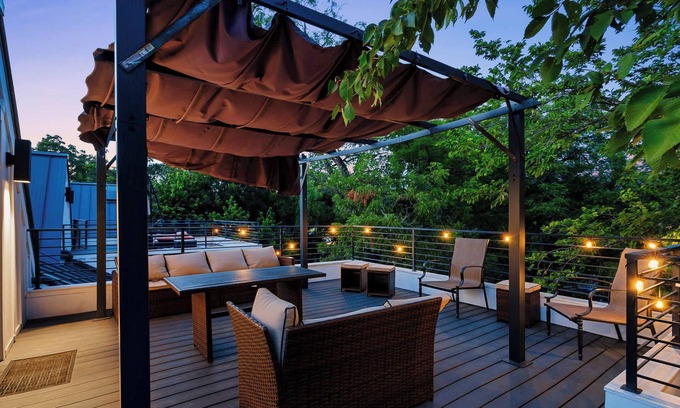Upstay presents this entire 2-home duplex in East Austin, that can host up to 37 guests at a time. Perfect for corporate retreats, large family reunions, or any big group getaway. This place has an awesome outdoor ground level lounge area with a gas fireplace table, patio heater, and BBQ grill. There's also an outdoor hot tub. Inside, you'll spacious living areas, fully equipped kitchens, and billiards/poker tables. There are laptop friendly, dedicated workstations and we offer free WiFi.
