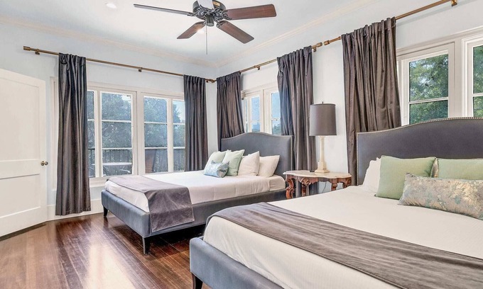 This historical Old Enfield home, built in 1910, was carefully restored to its original state and formerly the home of Texas Governors Ma (Miriam) and Pa (James) Ferguson. It has 7 bedrooms, and 5.5 bathrooms, and is large enough to host 22 guests at a time. Each of the 3 King bedrooms has an ensuite bathroom, and all the bedrooms come with fresh linens and fluffy bath towels. Additionally, there are 3 couches with pull out beds in the living rooms, 1 on the 1st floor and 2 on the second floor.