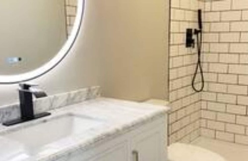 Luxuriate with a full bathroom and a half-bath on each floor, with marble counters, 2 newly tiled showers with 10" rainfall showerheads and handheld wands, large illuminated mirrors with bluetooth speakers, and hotel-style amenities like shampoo, conditioner, body wash, hairdryers, etc.