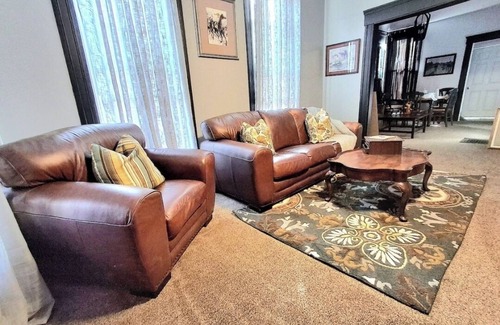 A leather couch and 2 super comfy leather chairs are perfect for watching all of your streaming platforms or local channels on the 80" Roku smart TV.