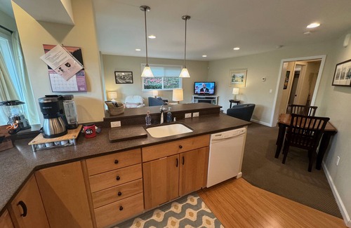 The first bedroom has a king size bed, huge closet and wall-mounted TV. The second bedroom has an inviting queen size bed, convenient storage and a large window looking out on the wooded garden. This bedroom adjoins the full bathroom with tub and shower, separate vanity with plenty of storage.