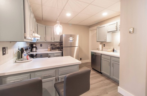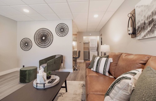 This apartment features an elegant layout, complete with a breakfast bar that seats two. Relax in the cozy living area, furnished with a comfortable leather couch, providing the perfect retreat after a day of urban exploration. The master bedroom boasts a comfortable king-sized bed, ensuring a restful night's sleep. With its modern design and lively ambiance, Urban Woods Retreat is an ideal haven for those seeking a stylish and comfortable home-away-from-home experience in the heart of Duluth. Please keep in mind that this property consists of two units as wells as office space below, your apartment is completely private and exclusive to you.
