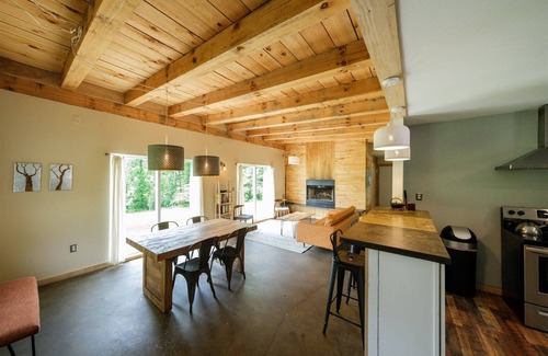 Ursa Major Cabin is named for the constellation "Big Bear", which is also the Big Dipper. This is our newest cabin on Star Gap road, set on a private 5 acre lot in the heart of the Red River Gorge. It is about 1/2 mile from the Red River and 10 minutes from Natural Bridge State Park, Red River Gorge Geological Area and the Daniel Boone National Forest hiking trails. Explore trails by day and sit back and relax around the fire circle and view stars at night. Or sit and view stars from the hot tub out back. This modern cabin has concrete counters, big windows with views, a large ktichen, two bedrooms rooms with queen size beds, a large bathroom with a full bath tub. In the winter, enjoy the wood burning fireplace for a cozy enviroment. There is a grill, patio, firepit and plenty of outdoor space to hang out in the warmer weather. We reguarly see dear crossing the yard or standing to graze on the spacious grassy area out front. Be aware of chiggers in the yard if you sit and have a picnic on the grass!