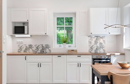 2-room apartment on the ground floor. Very beautiful furnishings: living/sleeping room with 1 double sofabed (140 cm), TV. Exit to the balcony. 1 room with 1 double bed. Kitchenette (oven, dishwasher, 2 ceramic glass hob hotplates, kettle, microwave, electric coffee machine) with dining nook. Shower/WC. Balcony. Balcony furniture. Beautiful view of the garden and the forest. Facilities: hair dryer. Internet (WiFi, free). Parking. Suitable for families. Maximum 2 pets/ dogs allowed.
