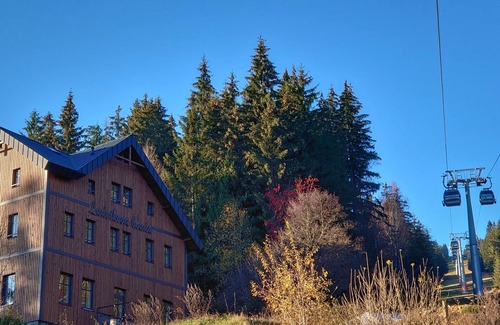 Beautiful chalet "Ludvíkova bouda", 3 storeys, detached, renovated in 2023. 15 apartments in the property. On the outskirts, 1.5 km from the centre of Janské Lázně, in a secluded, quiet, elevated position, along the wooded area, 500 m from the skiing area. In the house: restaurant, WiFi, central heating system. Breakfast and half board on request (extra). Parking at the house. Grocery 1.7 km, restaurant 10 m, bar 1.7 km, bus stop "Janské Lázně, Zátiší" 320 m, outdoor swimming pool 8 km, indoor swimming pool 2 km. Tennis 1.7 km, minigolf 800 m, cable car 600 m, chair lift, gondola lift, slopes 100 m, ski rental 700 m, ski school 700 m, children's ski school, sled run 800 m, cross country ski track. Nearby attractions: Lanovka na Černou horu 600 m, Janské Lázně Spa, Stezka korunami stromů 500 m, bobová dráha 5 km, Pec pod Sněžkou, Relaxpark, bobová dráha 11 km, Vrchlabí 10 km, Trutnov 12 km, Malá Úpa 15 km, Zoo Dvůr Králové, Adršpach 35, Karpacz 40 km. Well-known ski regions can easily be reached: SkiResort ČERNÁ HORA - PEC 600 m, Mladé Buky 5 km, Horní Malá Úpa 16 km, Špindlerův Mlýn 30 km. Hiking paths: Krkonošské naučné stezky. Please note: suitable for families, suitable for seniors.