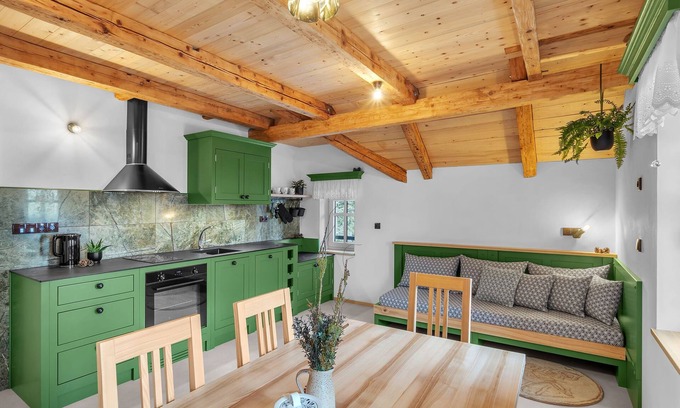 "V Mechu", 3-room apartment 47 m2 on 2 levels, on the top floor. Object suitable for 4 adults + 2 children. Luxurious and stylish furnishings: large living/dining room with dining nook and TV (flat screen). 1 room with 1 x 2 bunk beds, 1 double bed. Kitchenette (oven, dishwasher, 2 ceramic glass hob hotplates, toaster, kettle, microwave, electric coffee machine). Bath/WC. Floor heating. Upper floor: (steep stair), 1 open room with sloping ceilings with 2 beds (140 cm). Open small living room. Beautiful panoramic view of the valley. Facilities: washing machine. Internet (WiFi, free). Please note: suitable for families. No lift.