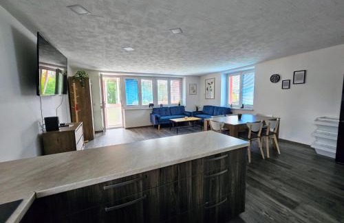 V patře se zahradou "Podhoubí" offers accommodations in Broumov, 20 miles from Kudowa Zdrój Train Station and 24 miles from Książ Castle. With garden views, this accommodation features a balcony. Free Wifi is available throughout the property and Polanica Zdroj Train Station is 19 miles away. Featuring a terrace and mountain views, the spacious apartment includes 3 bedrooms, a living room, flat-screen TV, an equipped kitchen, and 1 bathroom with a shower. Towels and bed linen are available in the apartment. The property has an outdoor dining area. For guests with children, the apartment offers outdoor play equipment. Guests at V patře se zahradou "Podhoubí" can enjoy skiing and cycling nearby, or make the most of the garden. Świdnica Cathedral is 30 miles from the accommodation, while Aqua Park Kudowa is 21 miles from the property.