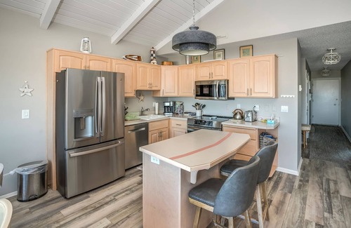 Fantastic Ocean view. Just a few moments stroll to the beach. King bed in the main bedroom, Queen in the 2nd bedroom. Down comforters included. Sleeper sofa in living room. Maximum occupancy is 6. 55 inch Samsung Smart TV with Dish Cable and TV in master bedroom. Complimentary presto log daily. There is a full size washer and dryer for guests to use. Enjoy the start of the day with the Keurig coffee maker and a variety of coffee pods to choose from, as well as a frother.