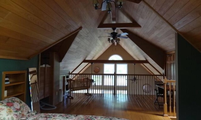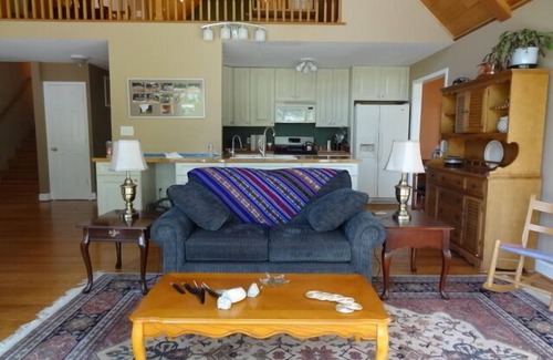 Main floor has 2 bedrooms with queen beds and 2 baths. Large loft area on second floor has 2 queen beds and 1/2 bath with double sinks. Great room has cathedral ceiling and wood stove. Fully equipped kitchen, bed linens and towels provided (bring your own beach towels.) Central heat/air, W/D, dishwasher, and WiFi . 1200 sq. ft. enclosed deck with doggie door. Borders inlet opening to Bay. Has 2.5 acres of yard and gardens located on quiet street. Kayaks, bikes, croquet and other games on premises.