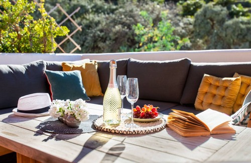 "Bahia", 5-room semi-detached house 227 m2, south facing position. Spacious and bright, comfortable and beautiful furnishings: living/dining room with digital TV, air conditioning and forced-air heating. Exit to the terrace, pergola. Kitchen (oven, dishwasher, 4 ceramic glass hob hotplates, toaster, kettle, microwave, freezer, electric coffee machine). Exit to the terrace. Sep. WC. Upper floor: 1 room with 1 x 2 bunk beds (90 cm, length 190 cm), air conditioning and forced-air heating. Exit to the balcony. 1 room with 1 double bed (180 cm, length 200 cm), bath/WC, air conditioning and forced-air heating. 1 room with 1 double bed (160 cm, length 200 cm), shower/WC, air conditioning and forced-air heating. Exit to the balcony. Shower/WC. 2nd upper floor: 1 large room with sloping ceilings with 1 double bed (200 cm, length 200 cm), digital TV, air conditioning and forced-air heating. Exit to the terrace. Porch. Terrace furniture, barbecue. Panoramic view of the sea and the countryside. Facilities: washing machine, iron, children's high chair, baby cot, hair dryer. Internet (WiFi, free). Property has four bedrooms, one really spacious with a seating area and its own private terrace. VUT/GR/06866