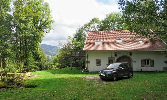 House "Escher", detached. 3.8 km from the centre of Thiéfosse, 42 km from the centre of Épinal, 110 km from the centre of Nancy, in a quiet position on a slope, 6 km from the lake, in the woods. Private: property 350 m2 with meadow. Patio, garden furniture, fireplace. In the house: sauna. Storeroom available. 200 m long bumpy, narrow motor access to the house (via unmade road). Parking (for 5 cars) on the premises. Supermarket 6 km, bus stop "Thiefosse Centre" 4 km. Groups of teenagers on request only. The tap water has no drinking water quality. Important note: Water supply from our own spring. In the event of extreme drought during the season, it may not be possible to guarantee an adequate water supply. In this case, the property will be cancelled by HHD free of charge and any amounts already paid will be refunded. The customer is not entitled to make any further claims in this regard.