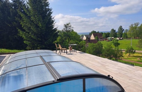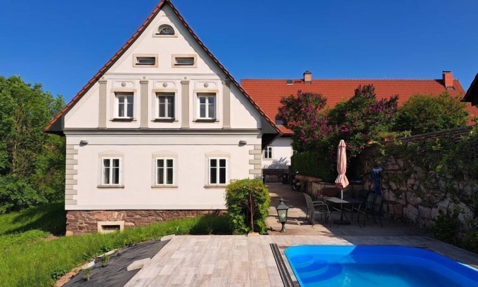 Šonov 7 km from Broumov: The stylishly renovated house located in the heart of the Broumovsko Protected Landscape Area is an ideal starting point for exploring the natural and historical beauties of the Broumovsko region and the whole of Eastern Bohemia. Comfortable farmhouse "Frilo", 2 storeys, detached, built in 1863, renovated. On the outskirts, in a quiet, sunny position, 2 km from the edge of the forest. Private: property 150 m2, swimming pool (5 x 3 m, depth 150 cm, seasonal availability: 01.May. - 30.Sep.) with shutter cover. Terrace, garden furniture, barbecue, fireplace, parking on the premises. Shop 8 km, restaurant 8 km, bus stop "Šonov, ZD" 250 m, outdoor swimming pool 15 km. Golf course (9 hole) 7 km, tennis 8 km, riding stable 10 km, walking paths from the house, cycle lane 10 m, ski lift 14 km, slopes 14 km, fishing possibilities 8 km. Nearby attractions: CHKO Broumovsko, Broumovské stěny 15 km, rozhledna Ruprechtický Špičák 17 km, Police nad Metují 20 km, Kaple Panny Marie Sněžné (Hvězda) 23 km, Adršpašsko-teplické skály 23 km, Góry Stolowe, Kladsko (PL) 22 km. Well-known ski regions can easily be reached: Janovičky 14 km.