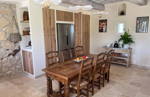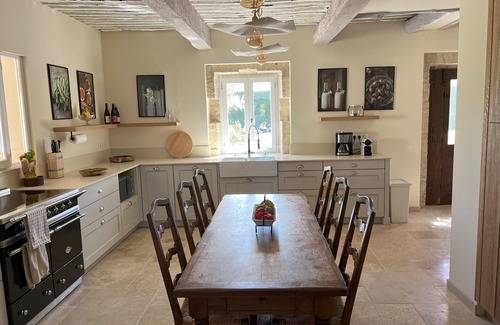 This holiday home with a heated swimming pool for 10 people is located in Vignières, in the countryside between Cavaillon and L'Isle-sur-la-Sorgue (Vaucluse department). A true invitation to relaxation in Provence. Near the Luberon natural park, this magnificent Provençal farmhouse with a 19th-century swimming pool combines the charm of authenticity with modern amenities, perfect for family or friends holidays. This farmhouse offers an ideal setting to enjoy Provençal landscapes while being close to major cities such as Avignon, Apt and Aix-en-Provence.