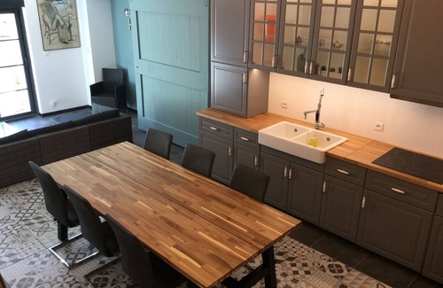 Fridge, 3-burner induction hob, oven, microwave, dishwasher, washing machine, filter coffee maker, Nespresso coffee machine, kettle, toaster, dining table for 8 people