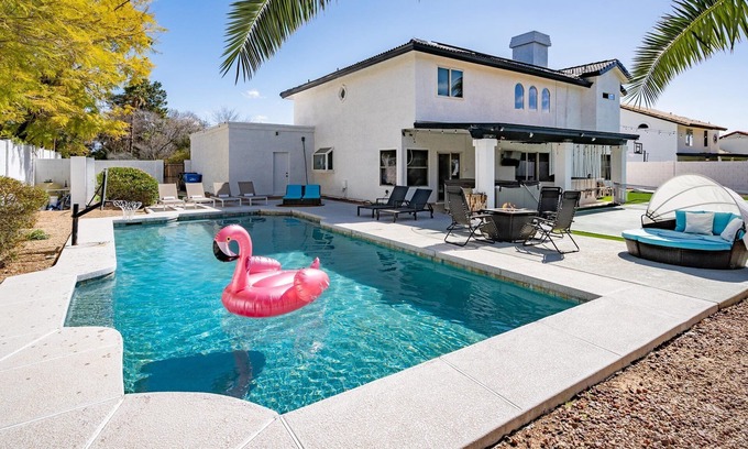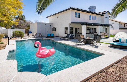 Welcome to your dream vacation home in Scottsdale! This stunning Tulum inspired 7-bedroom, 3-bathroom home boasts a perfect blend of luxury and relaxation. The home's convenient location is less than 5 minutes from Kierland Commons, where you'll find an array of shops, restaurants, and entertainment options. With its vibrant and unique design, this vacation rental is the perfect getaway for you and your loved ones. Step outside and be transported to a private oasis, complete with a sparkling pool, soothing spa, and a bar with swing seating, perfect for sipping your favorite cocktail. You'll also find a pickleball court, bocce court, putting green, and cornhole, making this the ultimate backyard for friendly competitions and outdoor fun. As the sun sets, gather around the fire pit and enjoy the warm glow and the stars above. As you step inside, you'll immediately be impressed by the modern kitchen and spacious living areas, perfect for entertaining or relaxing with your loved ones. The house has plenty of room for everyone, including a fun kids room and game room with a pool table. If you need to work during your stay, some of the spacious bedrooms offer desks for your convenience.
