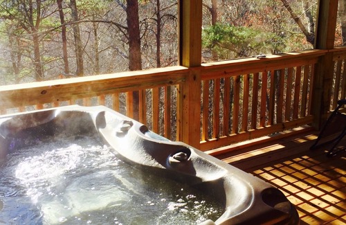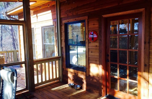 This is simply the Nicest and Best Appointed cabin in Mentone. I should know considering then next three in line are also our cabins! AND I designed and decorated it. This Beautiful Cabin was taken timber by timber from its original location in Kentucky. It has a sister cabin many of you have stayed in-Fernweh-666662. IT is new-old construction taking over a year to build. Construction finish date was November 6th 2016. It is also a sister cabin to 'Away from it All' vrbo-480579 which many of you have had the pleasure of staying in. The cabin is model pre-civil war construction, it was reconstructed using modern mortar technique and then added on to in its current location. The Cabin sits at the end of a private gravel road on 25 secluded acres on the deep section of the Little River. Has a fenced yard for your doggie. Secluded is an understatement. It is situated on a bluff overlooking the Crystal Clear East Fork of the Little River, just below a waterfall and a creek which can be heard as soon as you open the door to the car during the wetter seasons. We have an inviting large covered front porch with swing and with a larger open uncovered front porch with ample log furniture where many a book has been read in the fragrant mountain air. There is also a covered and screened back porch and an open Back porch! The Cabin itself retains all of its antique charm as you enter the Great room with its stone double sided wood-burning fireplace serving the great-room and the Master bedroom both located on the lower floor. The Upstairs is separated by a staircase that leads to a private spacious upper loft that contains a King and 2 Queen Beds. The Master Bedroom downstairs is off of the Great-room and is garnered with mountain views through perfectly placed casement windows and King Bed, situated perfectly so that you can see the woods and sunrise from the bed. Enjoy the Wood Burning Fireplace in the Bedroom. Off of the Master Bedroom is a Beautiful Master bath with stone walk in shower and copper slipper tub, set below a large window overlooking the woods. All sinks were imported from a copper-smith in Mexico. There is a fully functional kitchen with stainless Full size appliances/dishwasher/stove/oven/refrigerator/freezer/microwave and all cooking supplies you could possibly need. One Bathroom Downstairs off of the Great-room with a combo-shower and bath Samsung HE Washer and Dryer, and a Master Bath off of the Master Bedroom with a Walk in Stone Shower, and Large Copper Slipper Tub. High Efficiency Samsung Washer and Dryer. 2 Flat Screen TV's with Direct TV up and downstairs with /DVD/Wireless Internet/Direct TV Network Sports/Central Heat and Air. I Message available-Cell phone coverage is available from the front porch though it can be spotty at times. I-phones work great through I-message or KIK/any internet messaging service. There is a Master Bedroom that overlooks a large elevated back porch over the river canyon and the river can be heard from an open window. There is a large stone hearth wood burning fireplace in the bedroom. The Bedroom opens onto a cozy screened in porch with a 5 person water therapy spa/hot-tub. There is a charcoal grill on the back porch. There is a fire-pit and picnic area above the river, and a built in natural trail to the river itself where depending on the water level you can swim/float/fish/lounge in the crystal clear mountain water. The house is about 10 minutes from Downtown Mentone, AL and 15 minutes from Fort Payne, AL for antique shopping/cultural activity/or fantastic food and music at the Wildflower Cafe or other restaurants. The canyon is also about 10 minutes away, and 5 Minutes from Alpine Boys Camp, Desoto State Park, Desoto Waterfall, and Lake. There are wildflowers galore and wild blueberries and blackberries and plums along the road depending on the season. Wildlife abounds everywhere. The Tin Roof provides a great sound to sleep to when it rains. The Cabin is beyond secluded on a private road. We accept 1-2 day rentals during the week-Mon-Thursday depending on availability, and 3 day rentals for the weekends. Just input your dates and I will get back with you with our availability by email or text. Wood is available. When you ask about dates we will respond with a contract sent to your email address if your dates are accepted and available. All dates are first come-first serve, so please respond quickly when you receive a contract. If you wait to make a decision then check the calendar again to be sure it still shows your dates available, it is updated several times a day as reservations are made. This area books up quickly all year long, so plan way ahead.