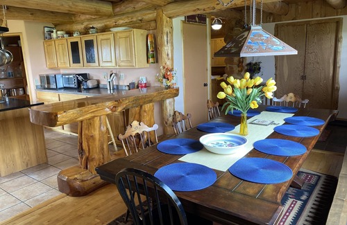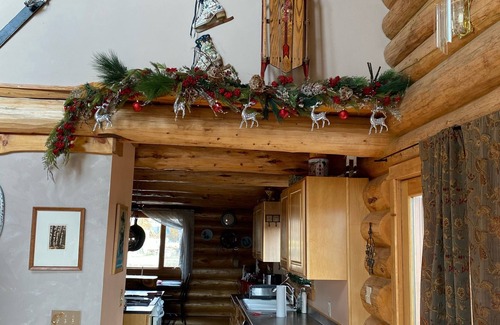 The Great Room boasts a 22 foot tall cathedral ceiling. The full kitchen includes ample counter space. A stunning handcrafted log bar centered between the kitchen and dining area draws your attention. The master bedroom is a spacious 20x20 feet with cathedral ceilings and a gas stove to give you a warm glow after a day outdoors. This room includes queen, full and twin size beds. Store your gear in the large entry closet. The laundry room has a washer, dryer and tub sink. A full bath rounds out the custom circular design of the main floor.